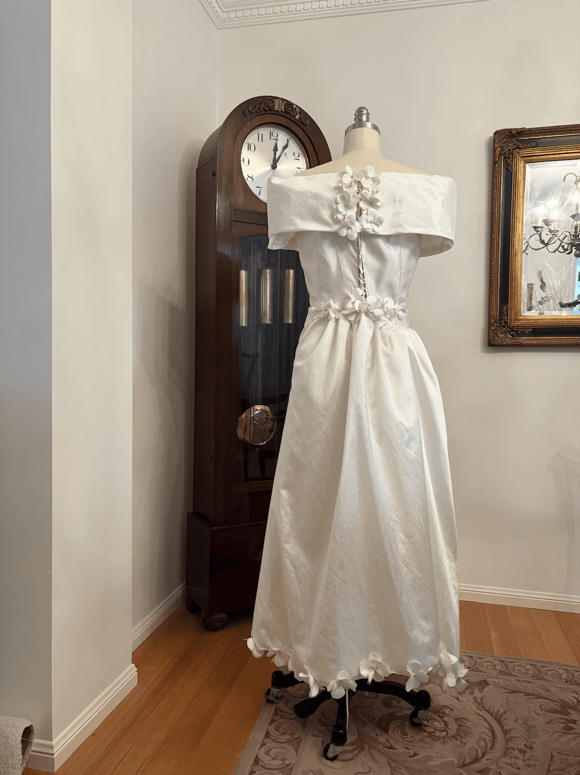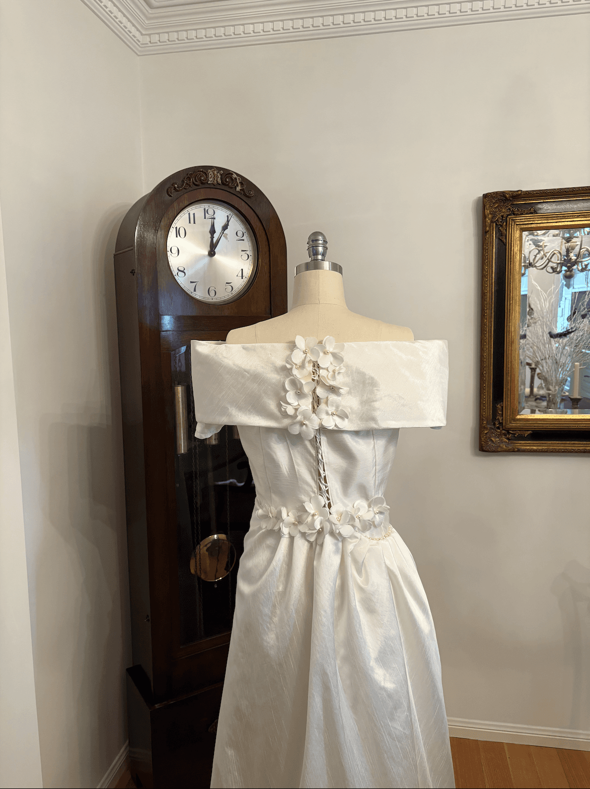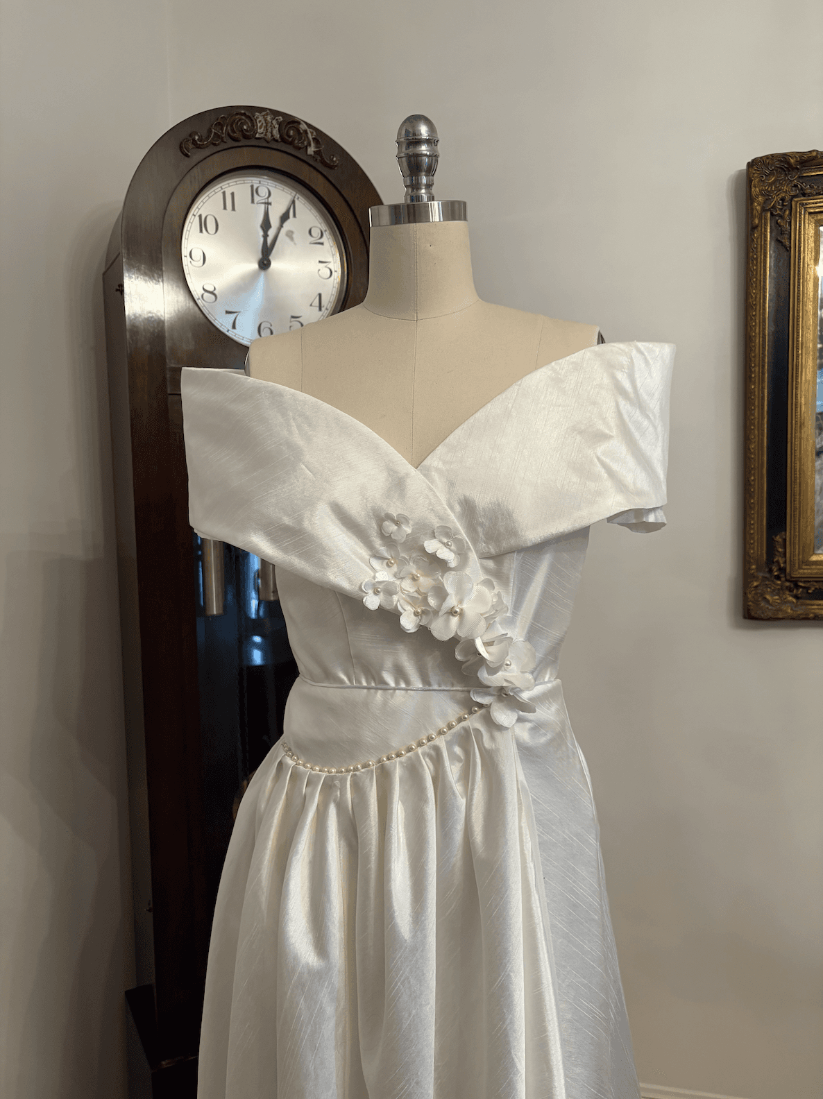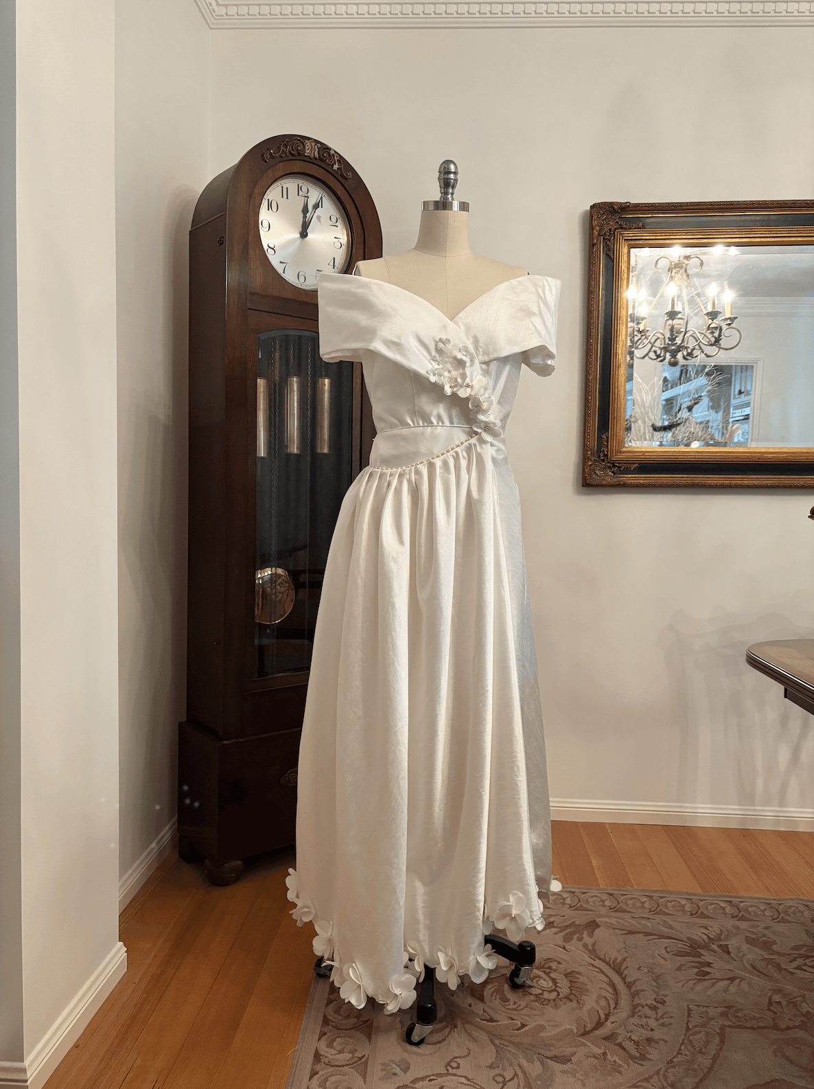 This one-of-a-kind wedding dress is crafted from lustrous ivory satin repurposed from a vintage bridal dress. It has an elegant off-the-shoulder neckline. It features delicate pearl embellishments, hand-cut floral details, a flattering wrap-around skirt, and a lace-up back—designed to beautifully accommodate multiple sizes.