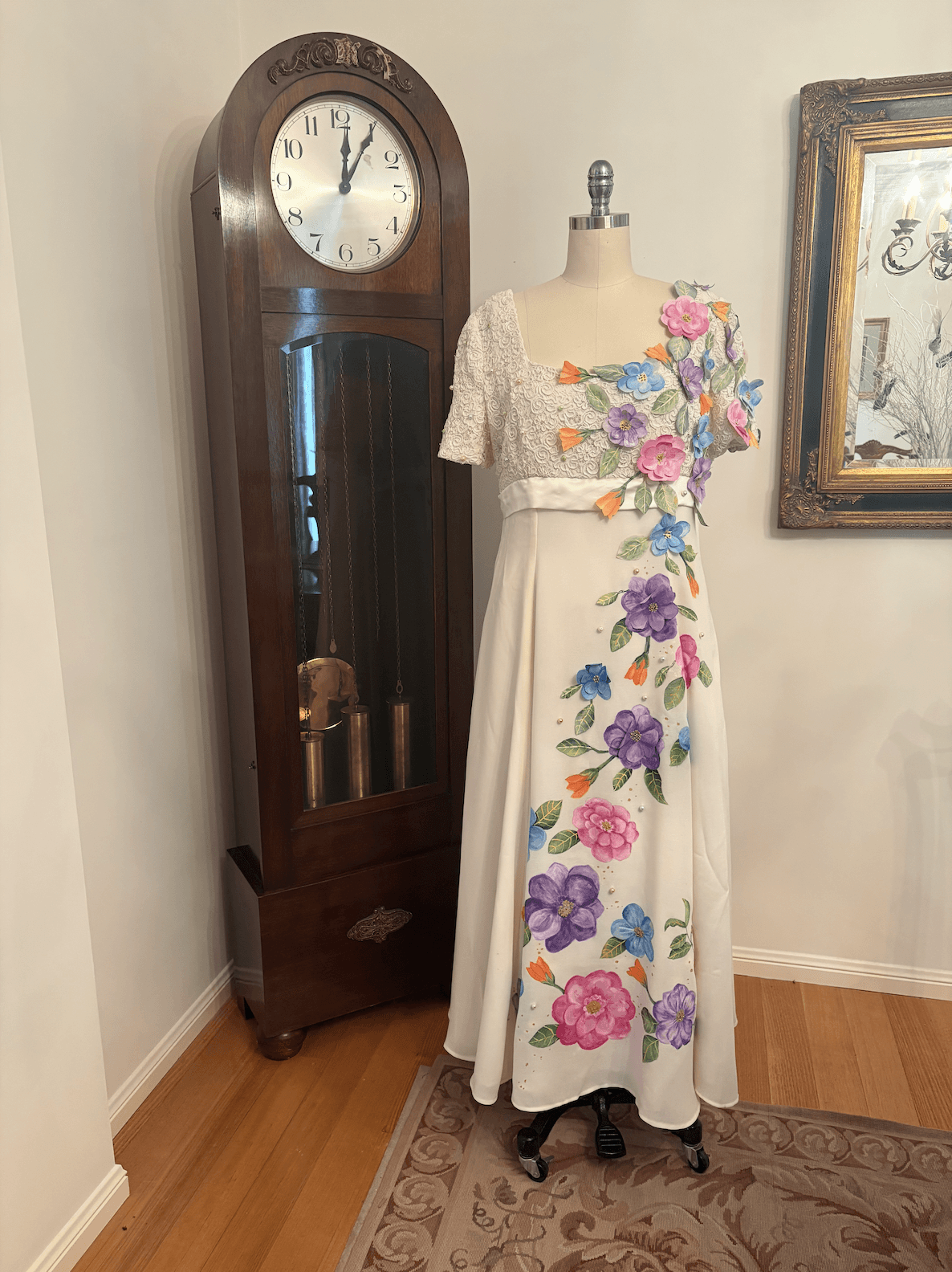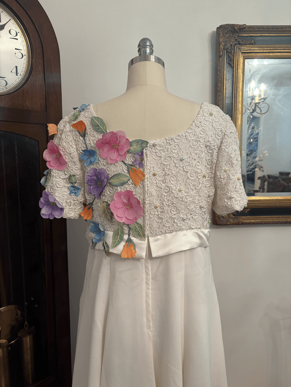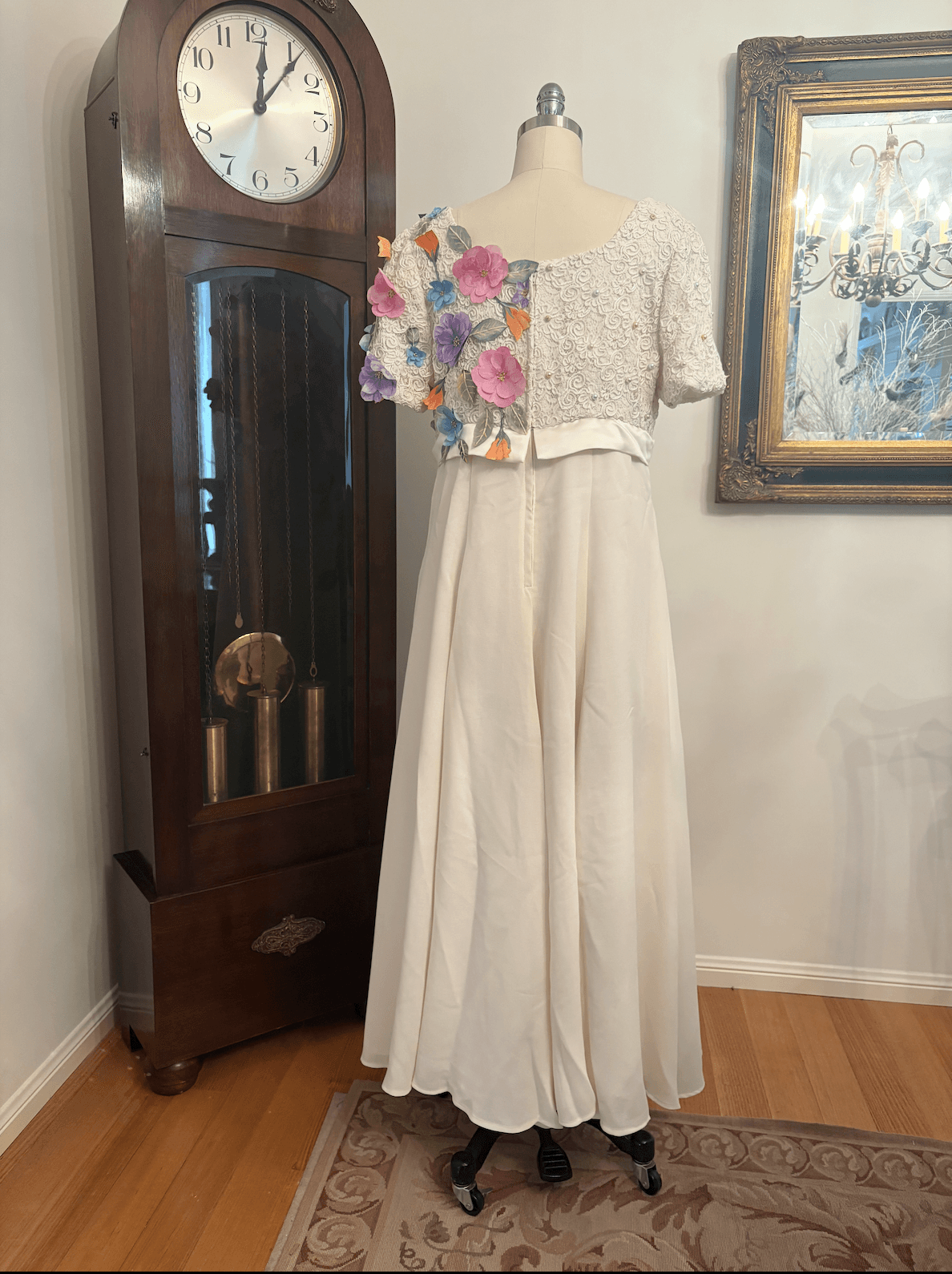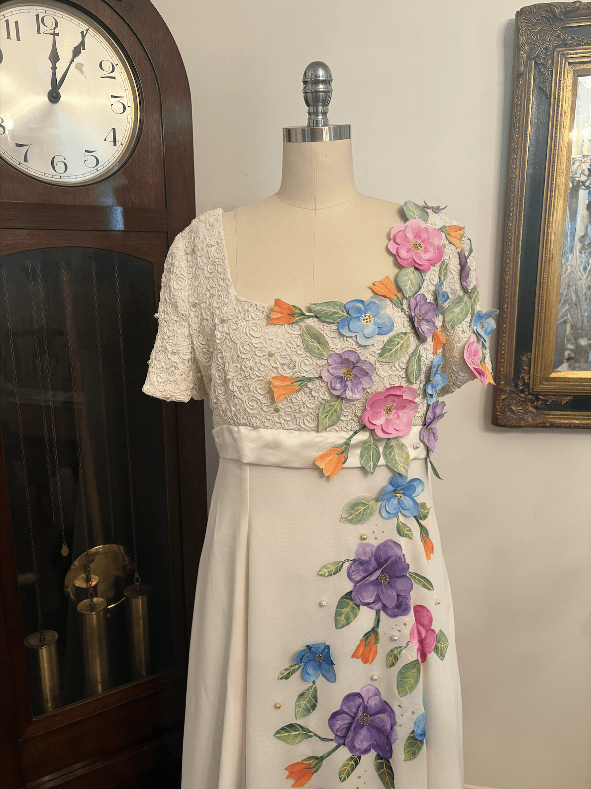 This one-of-a-kind dress has been thoughtfully repurposed from an original wedding gown into a stunning new creation. Designed with a timeless square neckline and elegant sleeves, it features an empire waistline that flatters the figure. Hand-painted silk flowers and leaves have been delicately sewn onto the dress, with additional hand-painted details cascading down the skirt. Coloured pearls are carefully stitched throughout, adding subtle shimmer and depth. Perfect as a wedding dress or a unique formal gown, this piece is truly one of a kind.