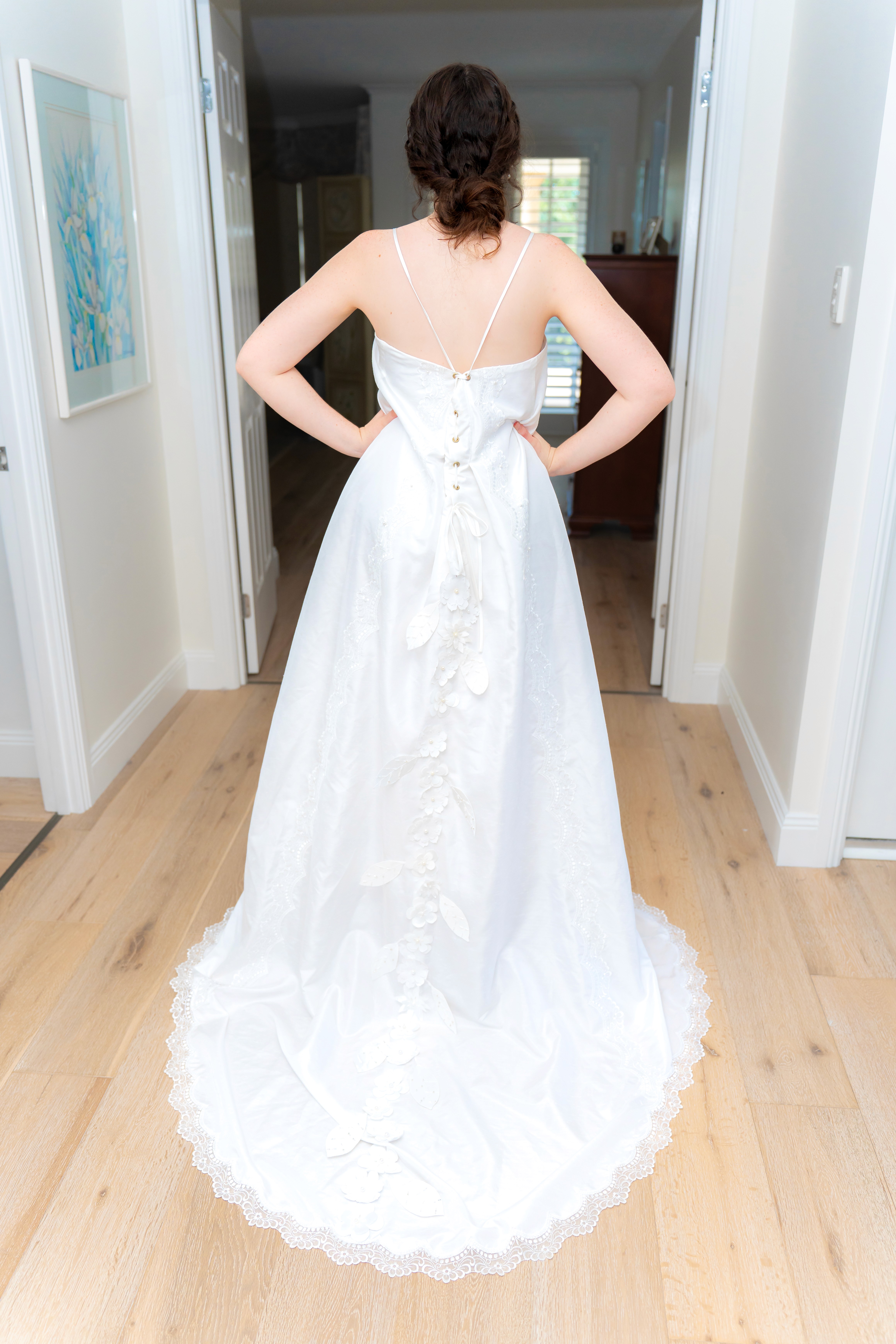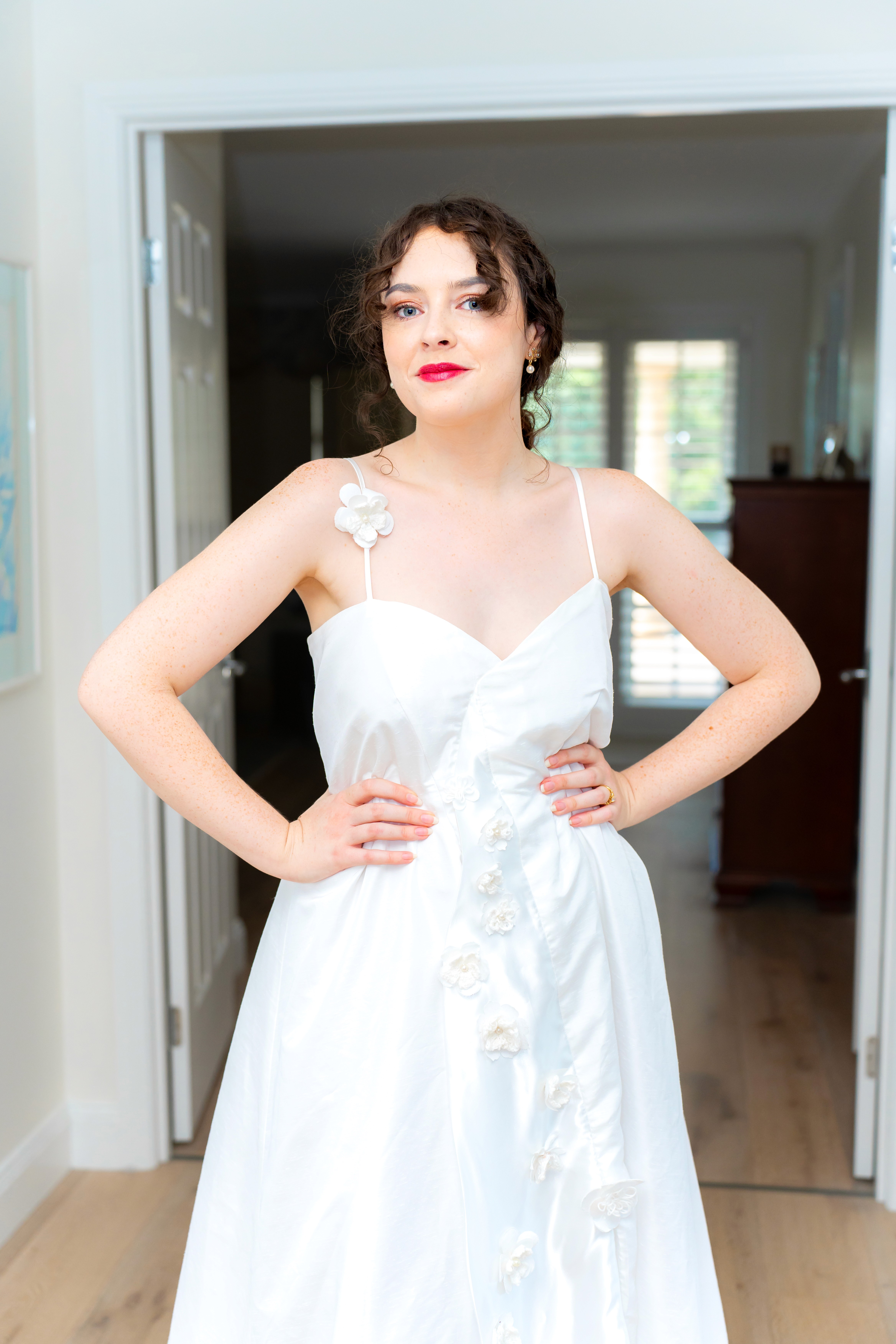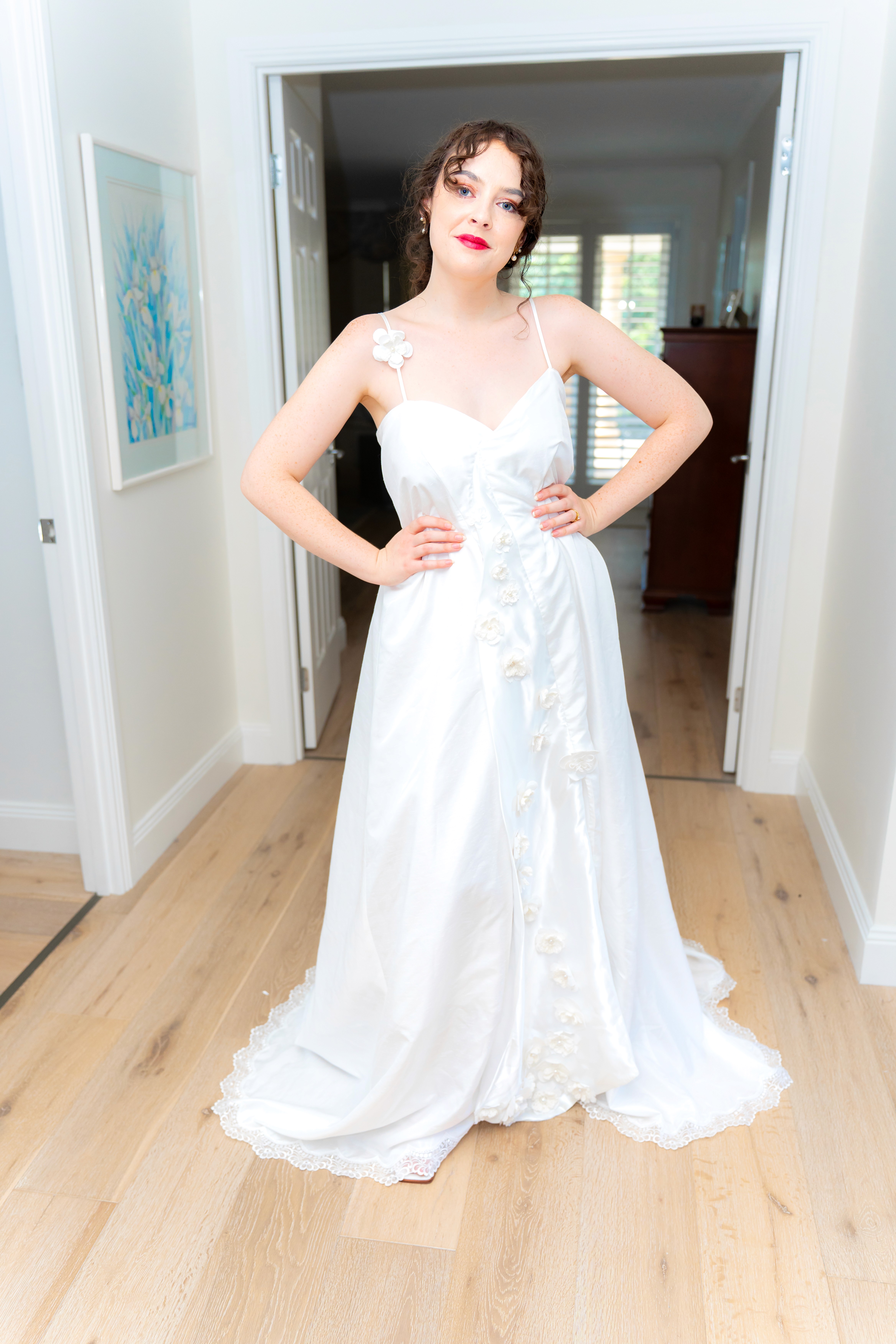 This dress is a one of a kind piece, thoughtfully upcycled from half of a vintage wedding dress skirt. Every flower and leaf has been meticulously handmade and hand-stitched, adding intricate, artisanal charm. Featuring a lace-up back and adjustable straps, the design allows for a flexible fit across multiple sizes.