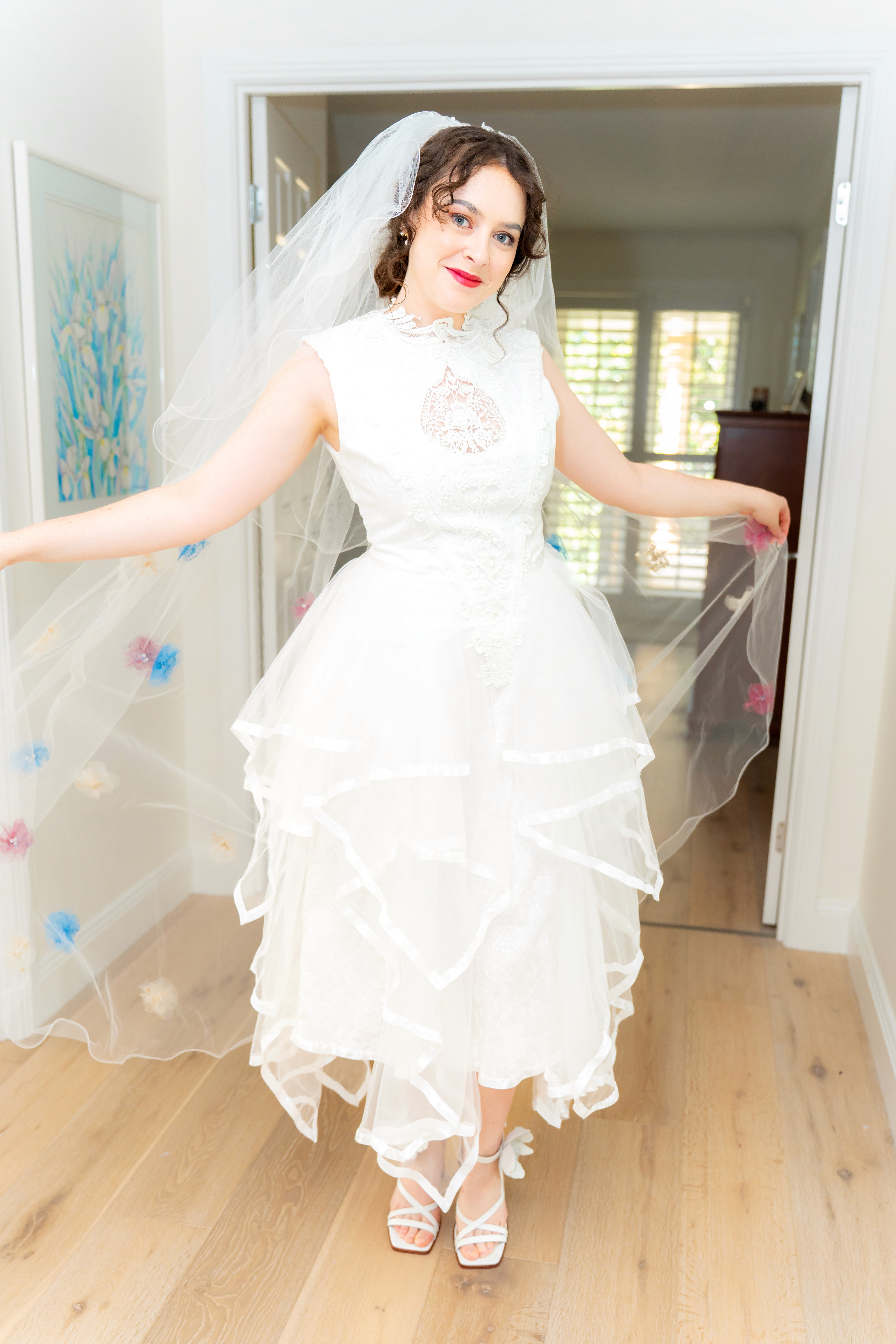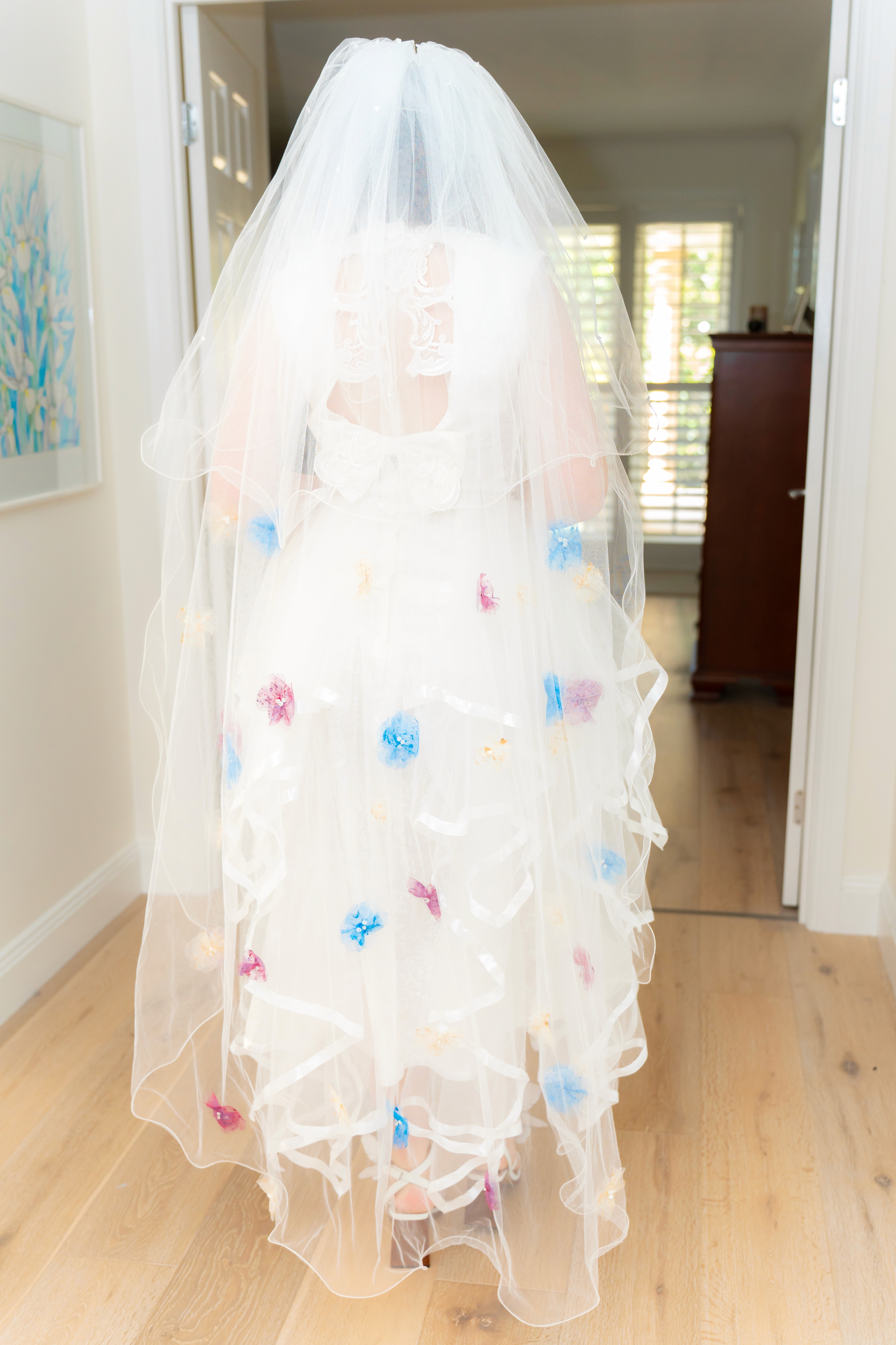 This veil has been crafted using a vintage wedding veil, with delicate flowers made from tulle offcuts that have been hand-cut, painted, and intricately beaded by hand. This veil has been made in Brisbane, Australia by Juliana.