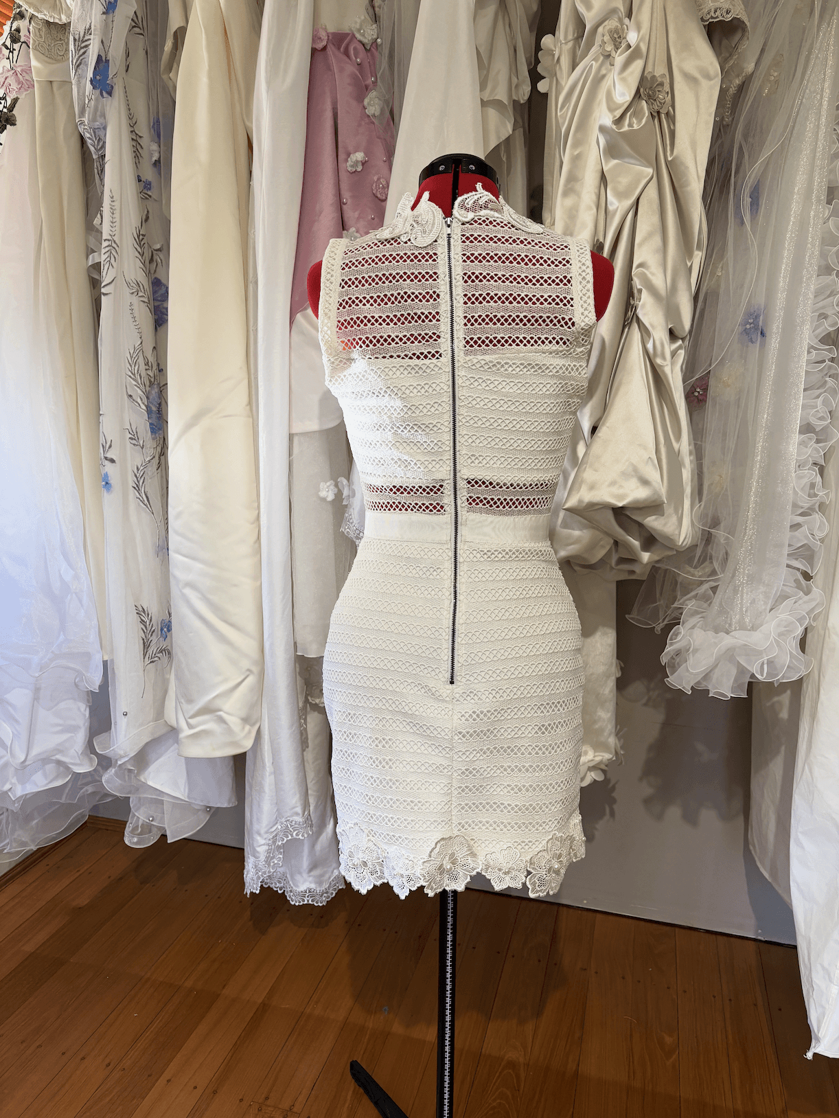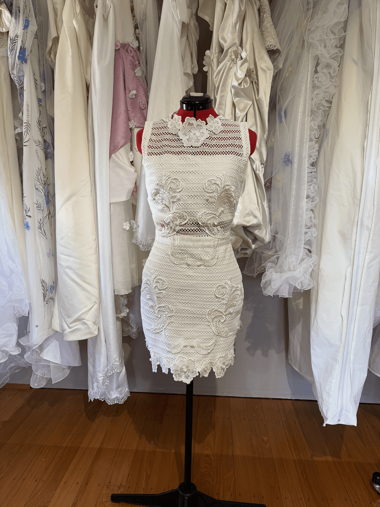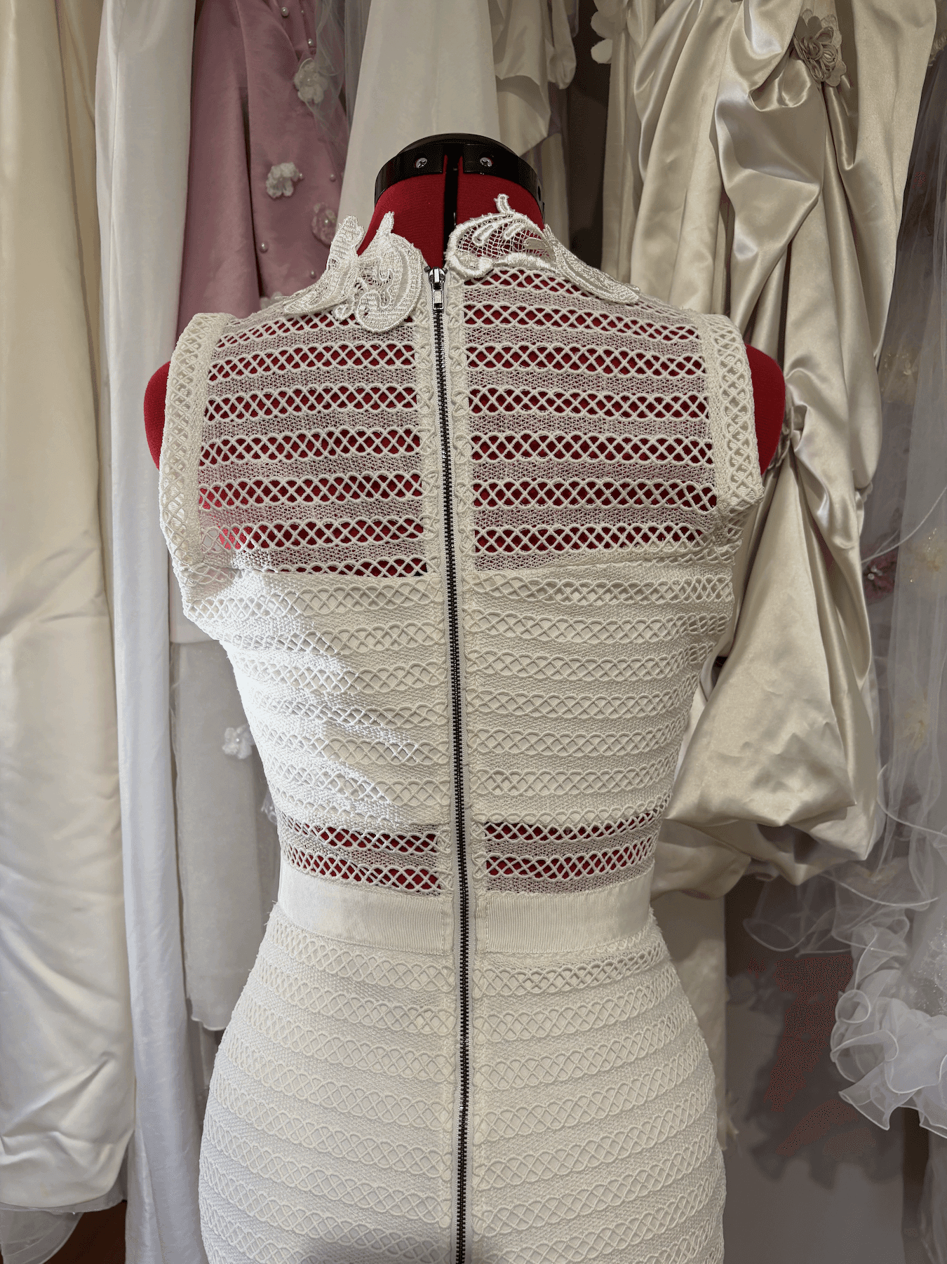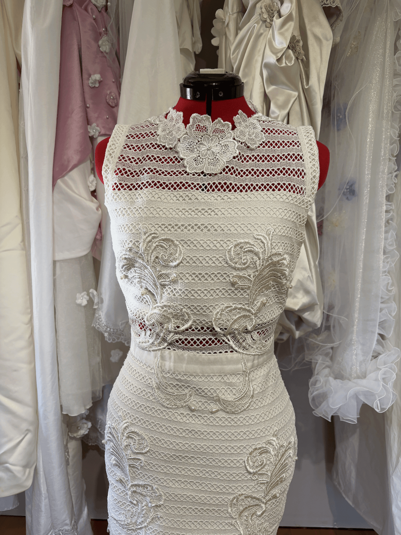 The high neckline and fitted silhouette offer a modern, sculpted shape, while the ornate lacework brings a sense of timeless romance. Every element has been thoughtfully reimagined, giving new life to forgotten materials and transforming them into something truly special.
