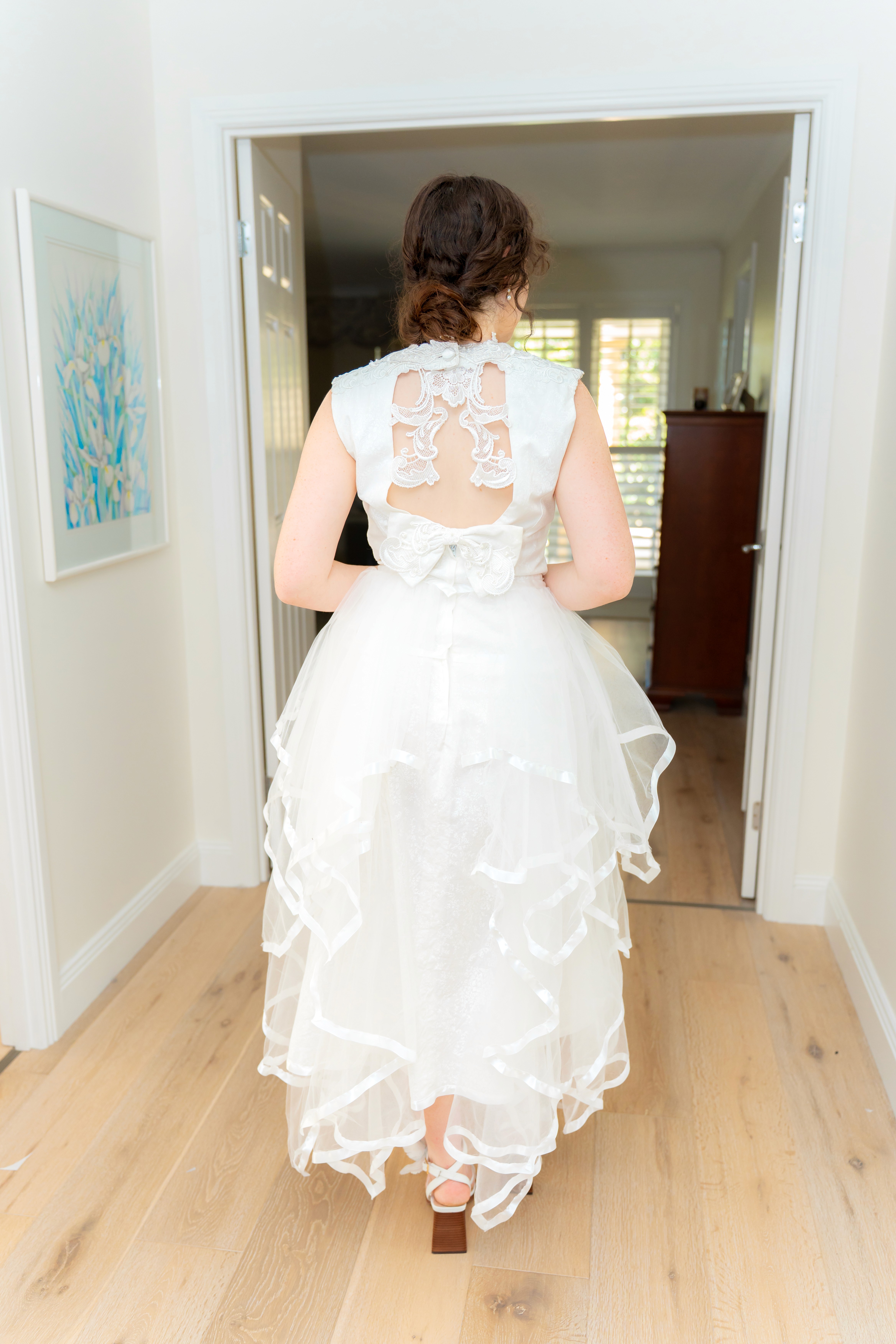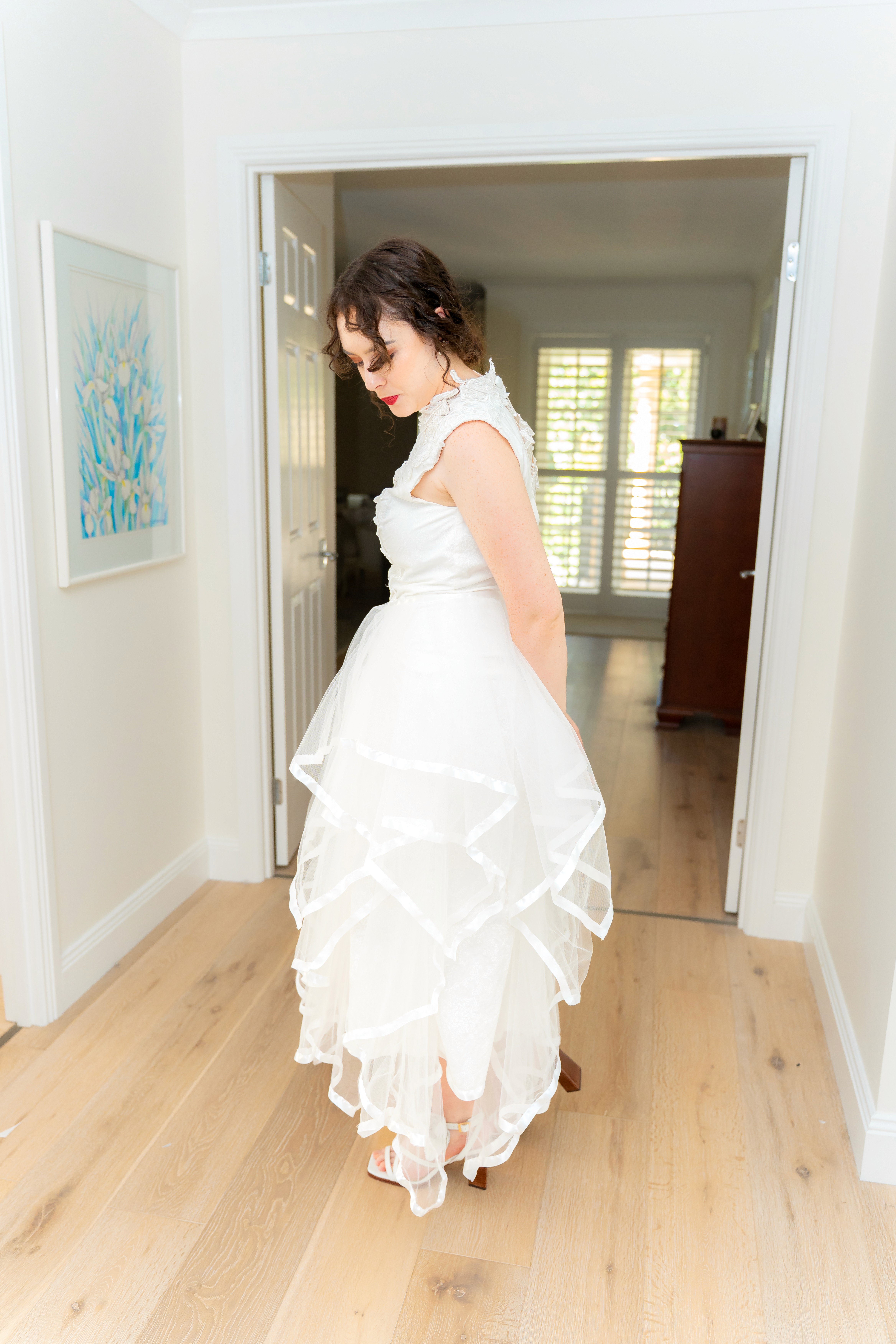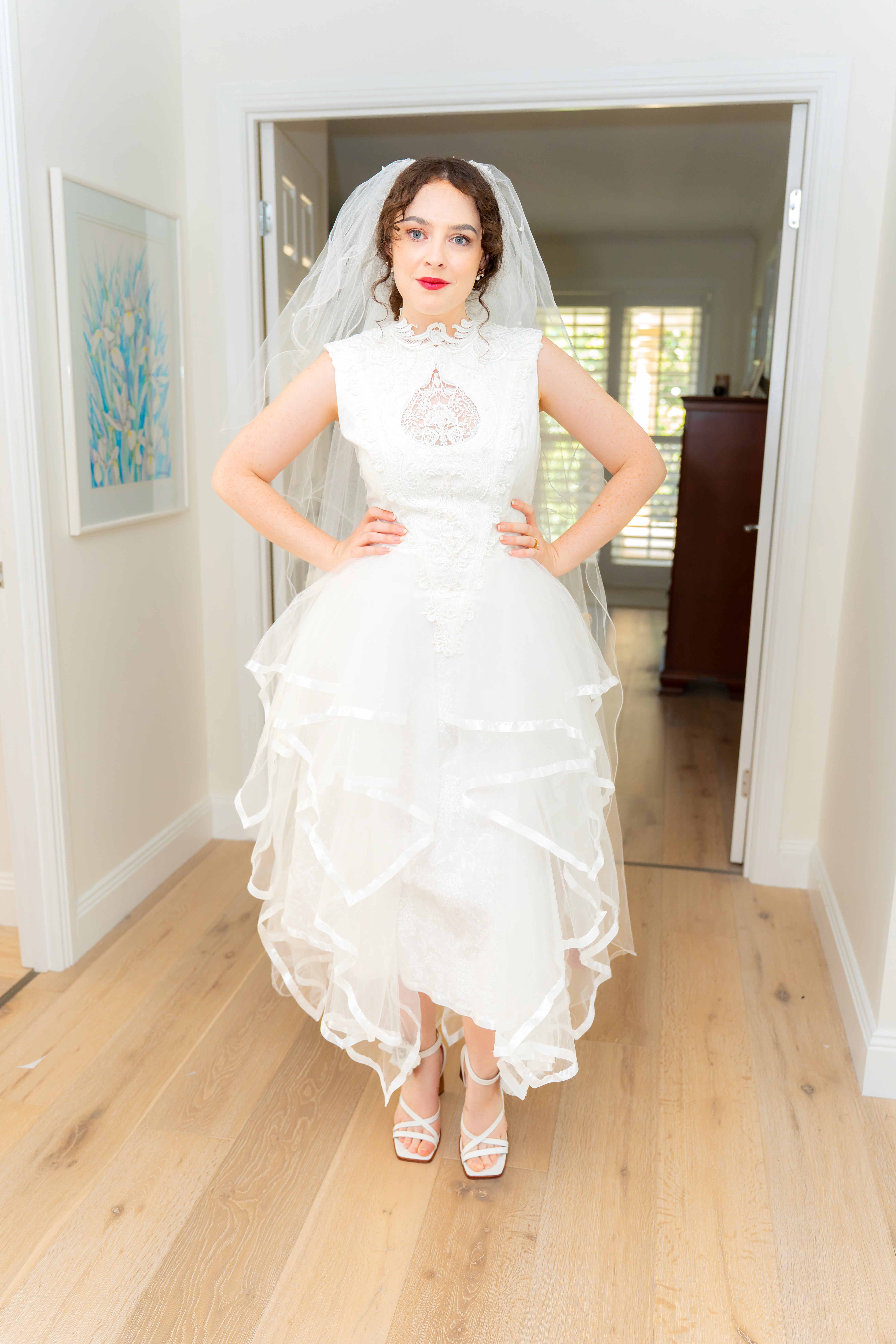 This one of a kind dress has been artfully crafted by repurposing a vintage Jessica McClintock bridal gown, complemented with lace off-cuts, soft tulle, and recycled pearl beads. Each element has been thoughtfully chosen to give new life to timeless materials.