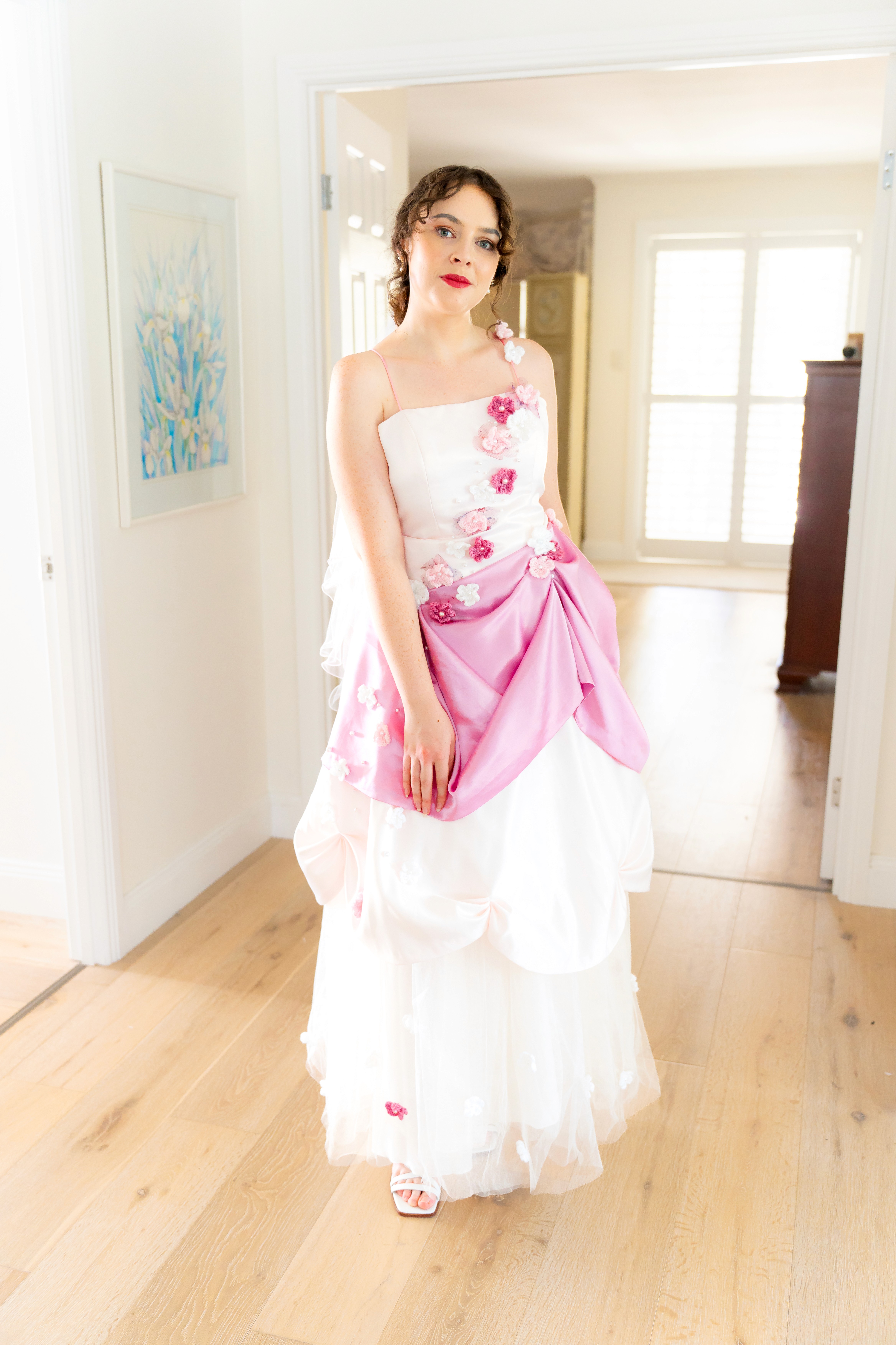This one of a kind dress has been thoughtfully crafted by repurposing elements from a light pink bodice and a mauve bridesmaid gown. Featuring a lace-up back for adjustable sizing, it combines both beauty and versatility. Delicate crocheted flowers have been hand-stitched onto the dress, which is also adorned with intricate hand beading for an elegant, artisanal finish.