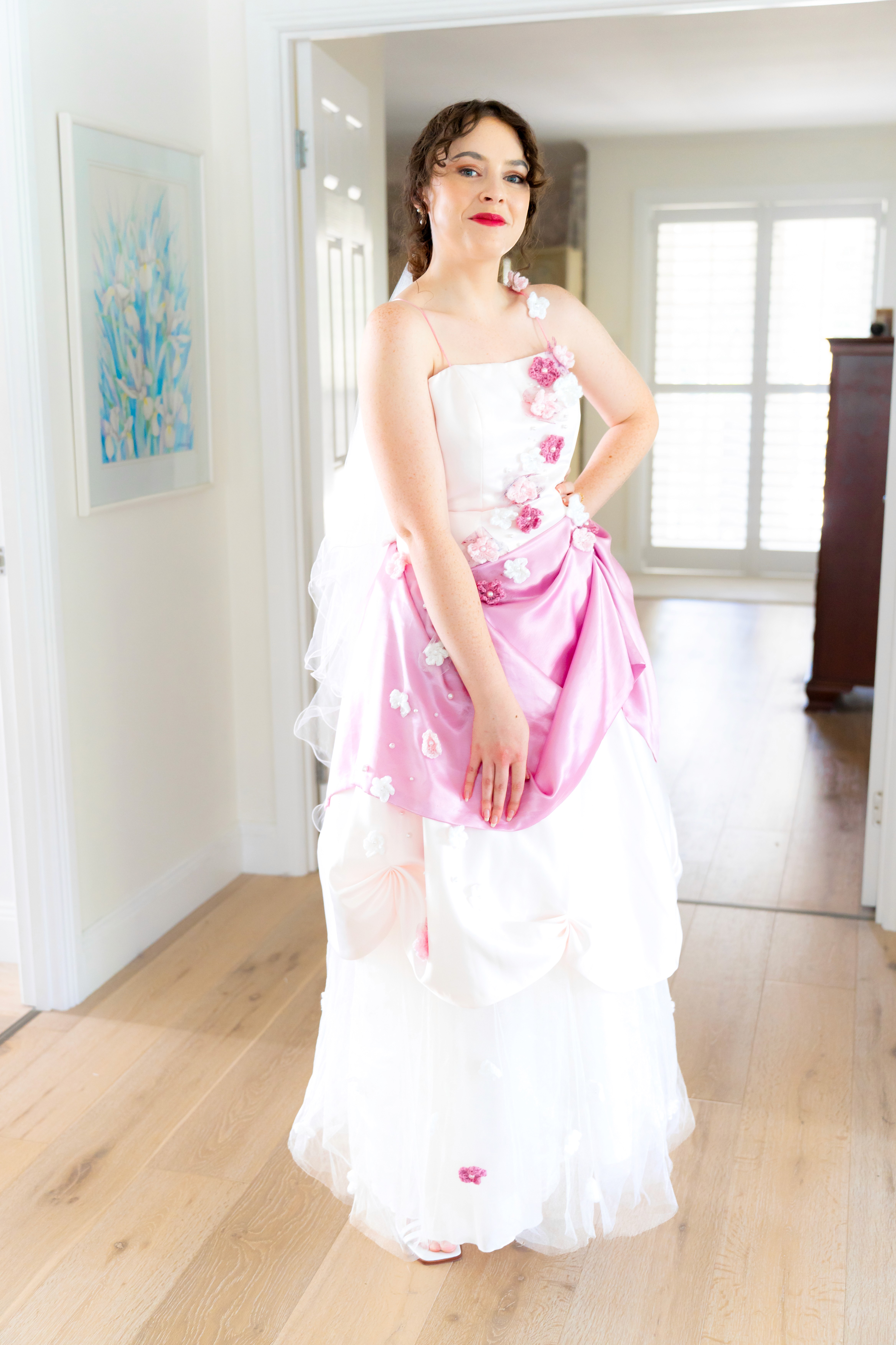 This veil has been thoughtfully crafted using a vintage wedding veil as its base. Delicate handmade crocheted flowers, each meticulously hand-beaded, add a unique and timeless charm. Made in Brisbane, Australia by Juliana.