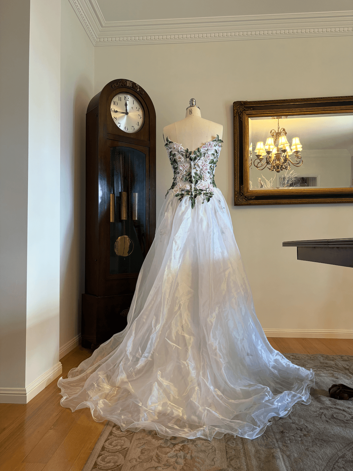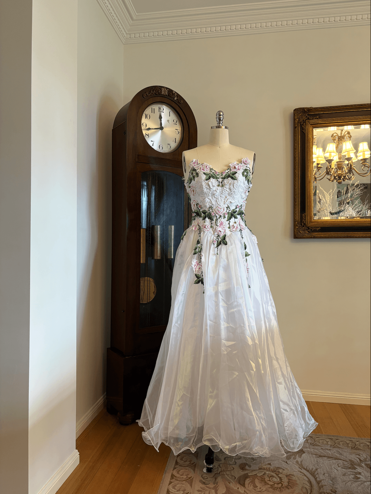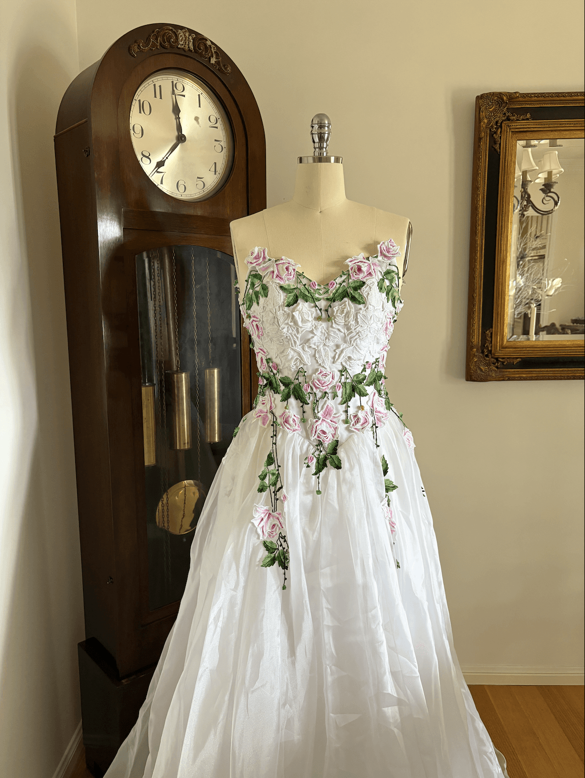 This enchanting dress feels like something out of a fairy tale. Carefully hand-painted and adorned with vintage lace, it features a delicate zip-up back for a timeless silhouette. Truly one of a kind, it's a piece made to be treasured.